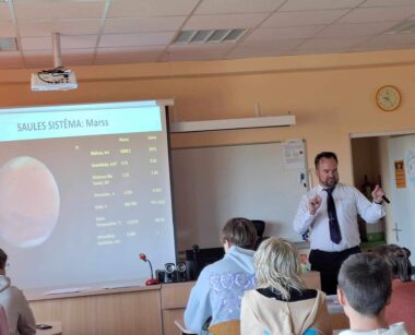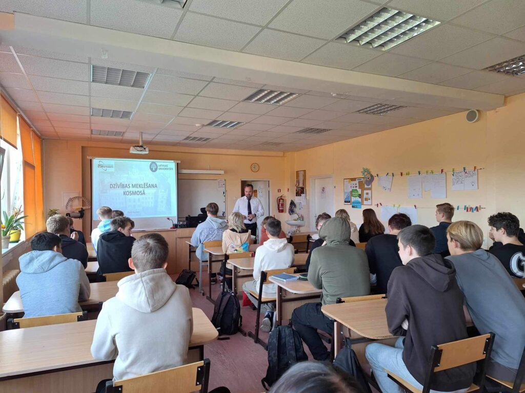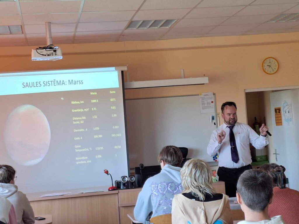 Mūsu skolā bieži viesojas skolas absolventi un labprāt tiekas ar skolēniem. Šoreiz saruna par dzīvības meklēšanu kosmosā notika gan 8.A klasei, gan vidusskolas 11., 12MTE/IM virziena skolēniem. Par līdzšinējiem sasniegumiem un jaunākiem atklājumiem stāstīja absolvents, Mr.sci.phys. Vitālijs Kuzmovs (Baltic Scientific Instruments, Latvijas Universitāte).